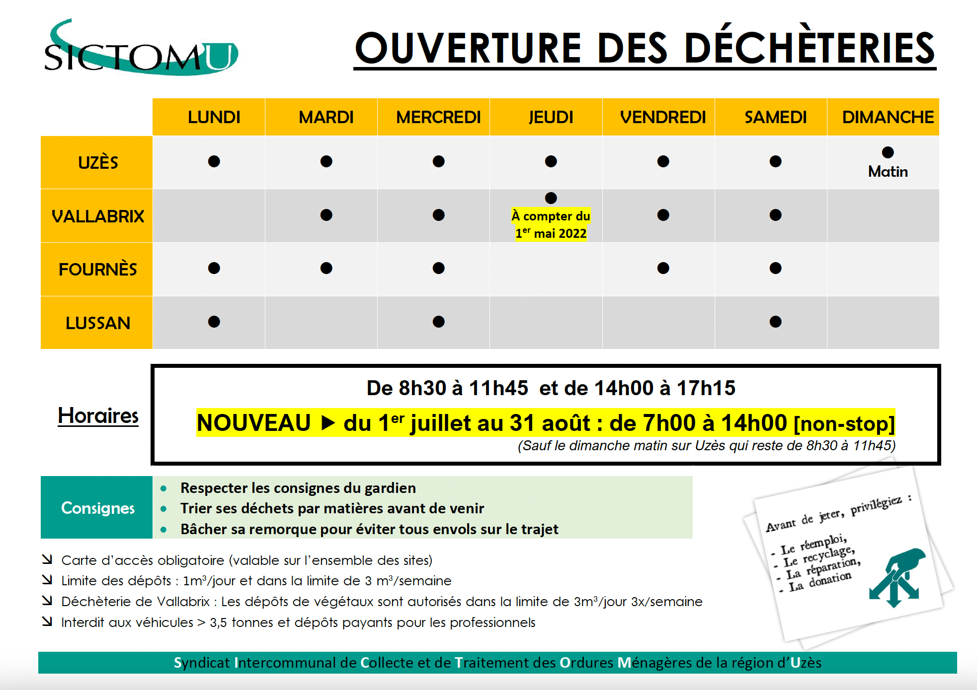 Du 1er juillet au 31 août : Modification des horaires d’accès sur nos 4 sites, à savoir: journée continu de 7H à 14H [non-stop] (excepté le dimanche matin sur Uzès qui conservera les même plages horaires d’accueil du public de 8h30 à 11h45).